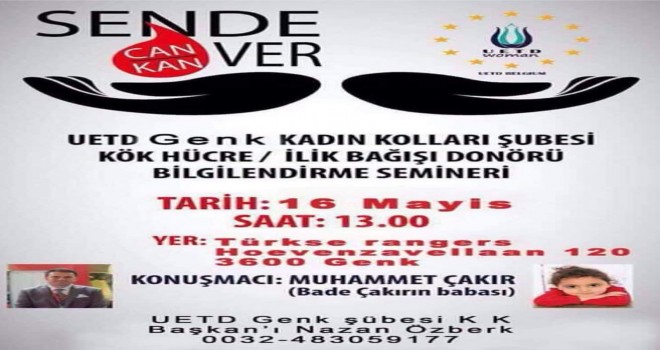 Seminerde Kök Hücre/ Ilik bağısı donoru bilgilendirme konuşmasını Bade Cakır'ın babası yapacağı seminer Turkse Rangers Hoevenzavellaan 120- 3600 Genk Waterschei-Zwartberg adresinde 16 Mayıs 2016 günü saat 13.00 de olacağı belirtildi.
