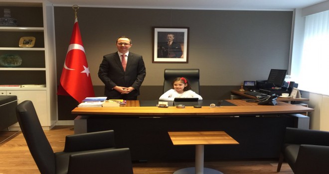 Türk Dili ve Kültürü öğretmenlerinden Zeynep Uludüz'ün eşlik ettiği İlkolkul 1. sınıf öğrencisi Eylül Öz ile 2. sınıf öğrencisi Teoman Hilhorst, Başkonsolos Ulusoy'un koltuğunu bir süre devraldı.