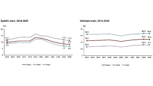Hanehalkı İşgücü Araştırması sonuçlarına göre; 15 ve daha yukarı yaştaki kişilerde işsiz sayısı 2025 yılında bir önceki yıla göre 147 bin kişi azalarak 2 milyon 966 bin kişi oldu. İşsizlik oranı ise 0,4 puan azalarak %8,3 seviyesinde gerçekleşti. İşsizlik oranı erkeklerde %6,8 iken kadınlarda %11,3 olarak tahmin edildi.