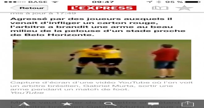 Agressé par des joueurs auxquels il venait d'infliger un carton rouge, l'arbitre a brandit une arme au beau milieu de la pelouse d'un stade proche de Belo Horizonte.