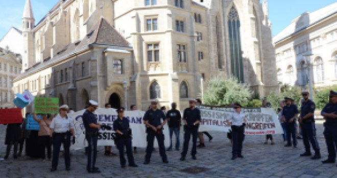 Ellerinde Kuran ve hurma ağacı bulunan aşırı sağcılar, 'İslam dünyaya hakim olacak', 'Burka herkes için', 'Çarşaf bugün bizim için, yarın sizin için' ve 'Özgürlük, cehenneme gidebilir' yazan pankartlar ile üzerinde 'İyi yolculuklar', 'Uyum yalandır' ve 'Tersine göç havayolları' yazan Viyana-İstanbul tek yön bilet pankartı açtı.